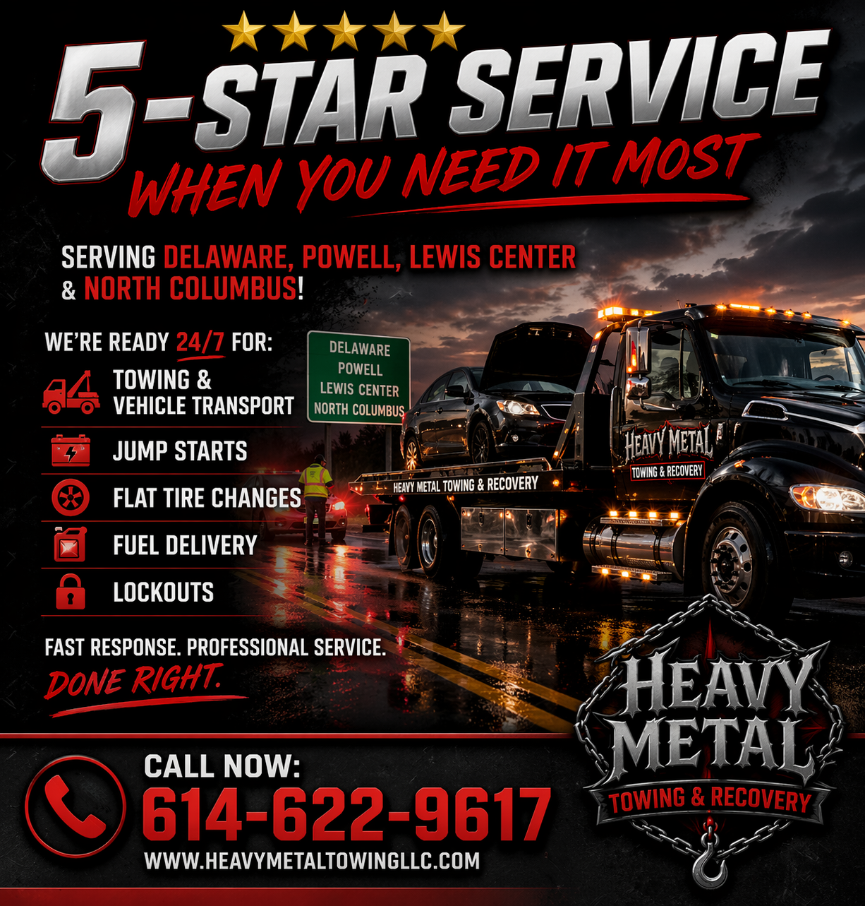 Heavy Metal Towing & Recovery proudly serves Delaware, Powell, Lewis Center, and North Columbus with fast, reliable roadside assistance. We offer: • Towing services • Jump starts • Flat tire changes • Fuel delivery • Lockouts Available 24/7 to get you back on the road quickly and safely. 📞 Call today: 614-622-9617 🌐 heavymetaltowingllc.com